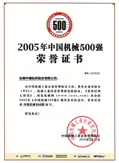 7月15日,2005年《中國機(jī)械500強(qiáng)》在北京人民大會(huì)堂隆重發(fā)布。其中一汽、上汽、中國兵器裝備集團(tuán)公司等50家上榜企業(yè)同時(shí)入選2005《世界機(jī)械500大》。此次活動(dòng)是由中國機(jī)械工業(yè)企業(yè)管理協(xié)會(huì)主辦,世界企業(yè)實(shí)驗(yàn)室、機(jī)械工業(yè)經(jīng)濟(jì)管理研究院協(xié)辦,世界經(jīng)理人周刊和國家機(jī)械網(wǎng)聯(lián)合承辦的。此次評(píng)選中,金屬加工機(jī)械制造行業(yè)有19個(gè)企業(yè)入選;安徽省共有16個(gè)企業(yè)入選;馬鞍山市入選的有2家企業(yè)(除我公司外,還有星馬汽車股份有限公司進(jìn)入了500強(qiáng)企業(yè));在500強(qiáng)企業(yè)中我公司位列第484位。