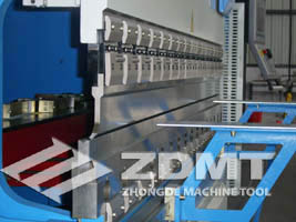 本系列液壓折彎機(jī)是雙缸上動式的數(shù)控液壓折彎機(jī),它通過伺服比例閥上的各類閥門動作來驅(qū)動左右油缸的伸長與返回,從而帶動滑塊的上升與下降。滑塊的同步采用全閉環(huán)電液伺服控制技術(shù),滑塊位置信號由兩側(cè)光柵尺反饋給數(shù)控系統(tǒng),再由數(shù)控系統(tǒng)控制同步閥的開口大小,自動調(diào)節(jié)油缸進(jìn)油量的多少,從而控制滑塊(Y1、Y2)軸的同步運(yùn)行,始終保持對工作臺的平行狀態(tài)。