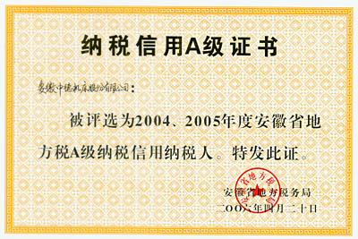 我公司繼被省地稅局評為“2001-2002年度省地稅A類納稅信譽等級單位”后,近日又被省地稅局評為“2004-2005年度安徽省地方稅A級納稅信用納稅人”。這是省地稅局對納稅人給予的最高榮譽,也充分體現了省地稅局對我公司近年來在稅務登記、納稅申報、稅款繳納、財務管理、納稅資料報送、發票管理等方面工作的認可。
